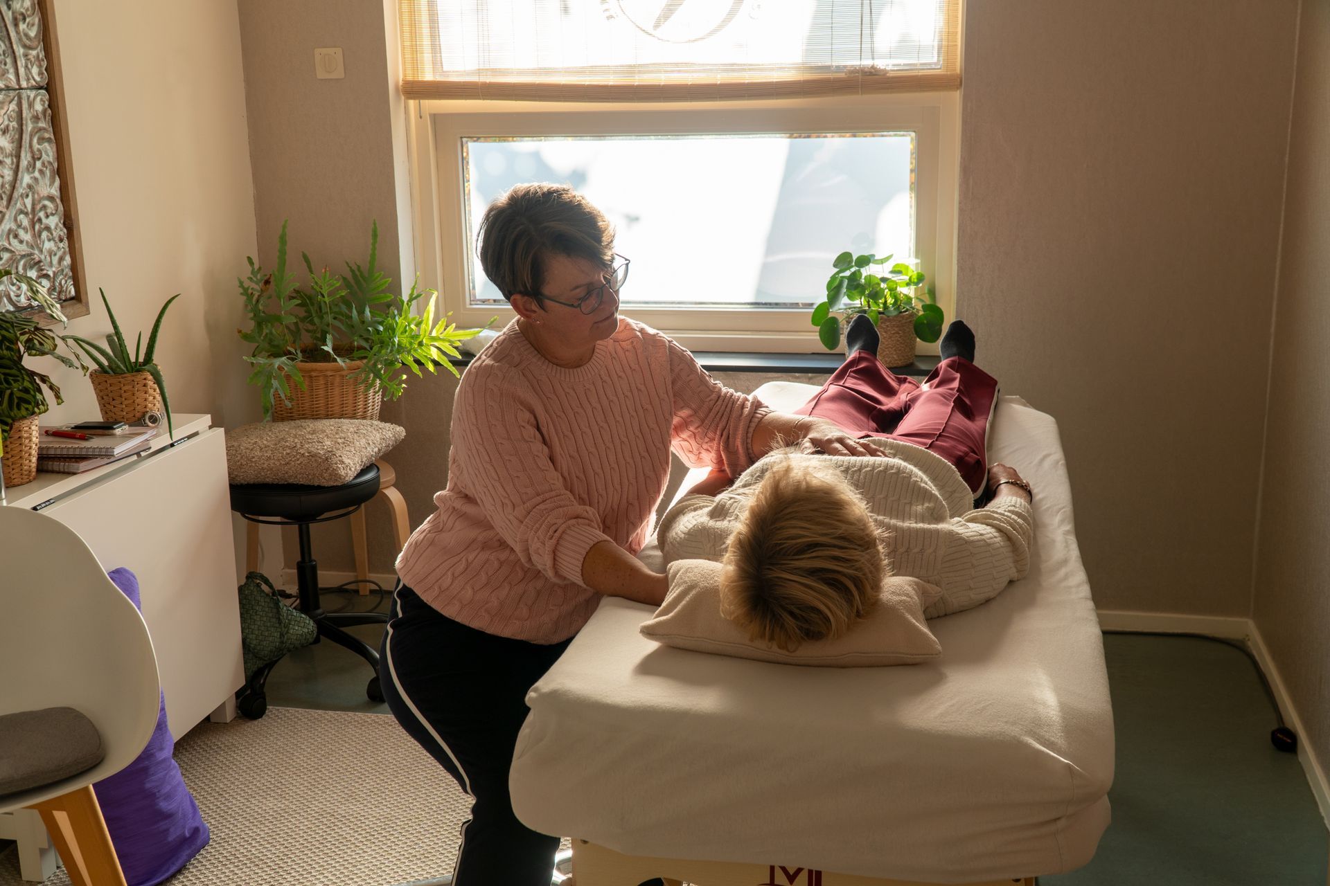 Ik kom al enkele jaren bij hem: hij heeft Parkinson èn dementie. Ik ken hem als een snel overprikkelde man die niet meer kan vluchten voor alle herrie en mensen om hem heen en hierdoor af te toe wat overkookt. Dit doet hij in stilte; hij verstijft letterlijk, maar in zijn lichaam kookt hij over. Mijn behandeling doet hem altijd diep ontspannen: zijn lichaam laat spanning los en hij kan alle stress over al die prikkels loslaten. Maar ineens is het anders: de laatste keer dat ik bij hem was, was hij wel gestrest. Ik voelde al die spanning in zijn lijf. Maar…hij was niet overprikkeld en kookte ook niet over. Heel stilletjes en langzaam was hij de volgende fase van dementie ingegaan: hij trok zich terug binnenin zichzelf en sloot zich af voor al die prikkels. Ik moest goed zoeken in zijn ogen om hem te vinden en ook in zijn lichaam voelde ik hem slechts heel ver weg. Mijn “behandeldoel” veranderde zo: van diepe ontspanning en afvoer van overprikkeldheid, werd het diepe ontspanning en hem weer vinden. Hem laten voelen dat hij nog niet weg is, maar dat ik hem zie en voel. Heel langzaam werd hij wat alerter, keek me aan en was weer wat aanwezig. Zijn vrouw die er bij zat, zag het ook: daar is hij weer even. Hoe verdrietig ook: deze naar binnen gekeerde fase is weer een stap achteruit. Het zich terugtrekken van deze wereld en op weg naar een volgende wereld. Voor mij als Craniosacraal therapeute was het mooi om te voelen, dat ik ook hierin een rol heb en iets kan doen. Hem laten voelen dat hij nog gezien wordt: dat hij er nog is. En voor zijn vrouw fijn om weer in zijn ogen te kunnen kijken en hun liefde daar te voelen.